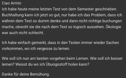 Falls Fragen zum Schulstoff auftauchen, hast du die Möglichkeit die Community zu fragen. Auch bei Fragen rund um Lernen, Prüfungsvorbereitung und Organisation steht dir der Gründer der Plattform (Armin) zur Verfügung.
